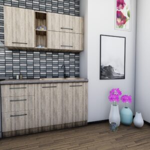 Setul de mobilier pentru bucătărie Casello Wood combină funcționalitatea cu designul modern, oferind soluții optime de depozitare și un aspect estetic plăcut. Setul include dulapuri superioare și inferioare, un blat de lucru rezistent și spații pentru aparatură electrocasnică integrată.
